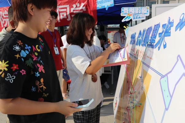 “同学,你从哪里来”主题展板,以中国地图为底,彩色丝线为桥,使新生们找到自己的家乡省份,一端系于家乡,一端系于校园,呈现出化院学子五湖四海共聚校园的一副温暖图景。